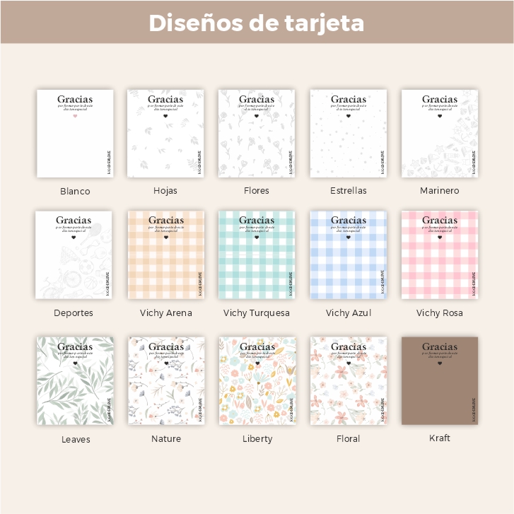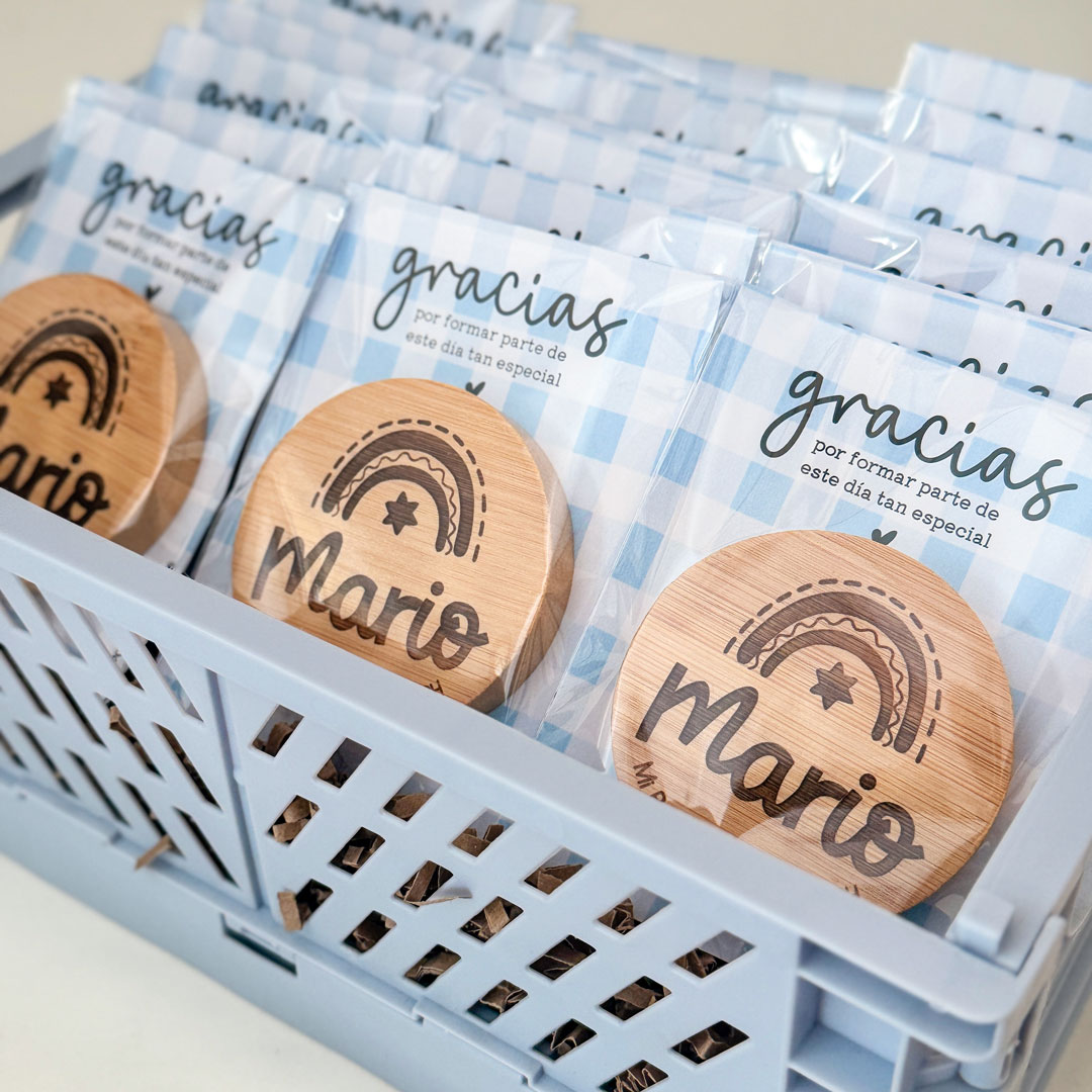 Elige entre todos los diseños disponibles el que más te encante, indícanos los datos que quieras que grabemos en él y elige la tarjeta de agradecimiento para el packaging. Sin duda será un detalle con el que sorprenderás a tus invitados.
