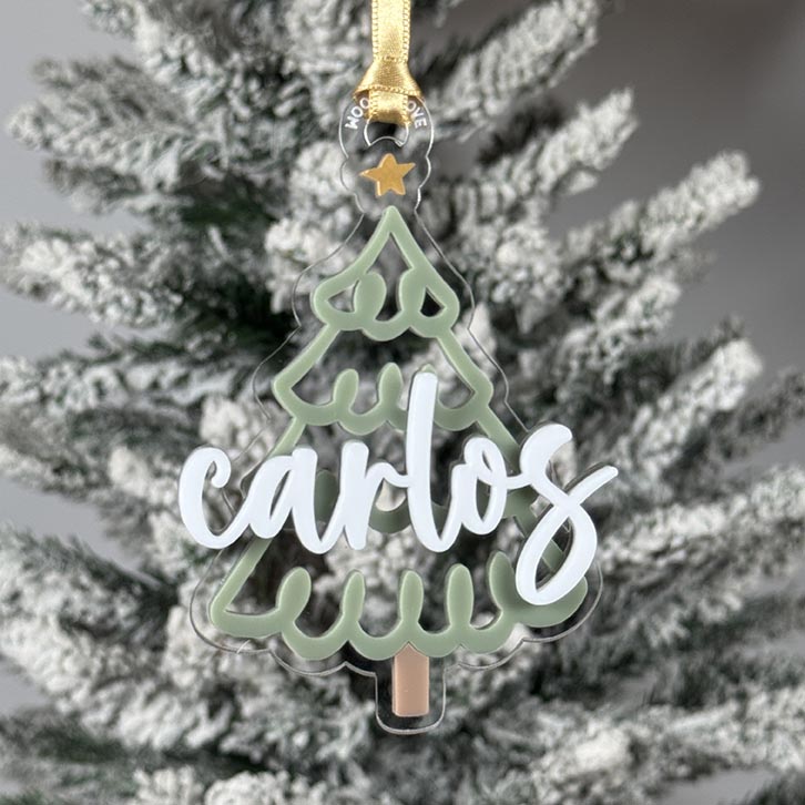 Adorno con forma de árbol de navidad con nombre y cinta de satén para colgar.