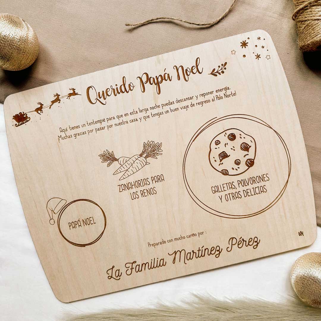 Bandeja de madera personalizada con la que los más pequeños de la casa podrán preparar con ilusión un tentempié a Papá Noel y sus renos, para que puedan descansar y reponer energía en esta larga y mágica noche.
