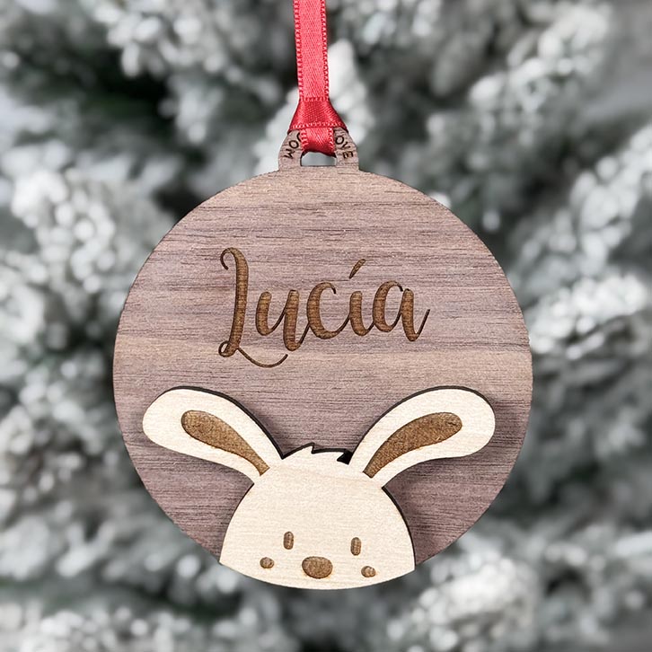 Bola de navidad en dos capas de madera natural con el nombre que quieras que grabemos y cinta de satén para colgar.