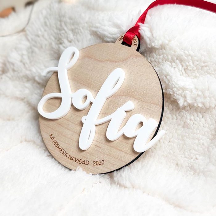 Bola de madera con acabado natural, nombre en metacrilato blanco y grabada con los datos que quieras que aparezcan. Cinta de satén para colgar.