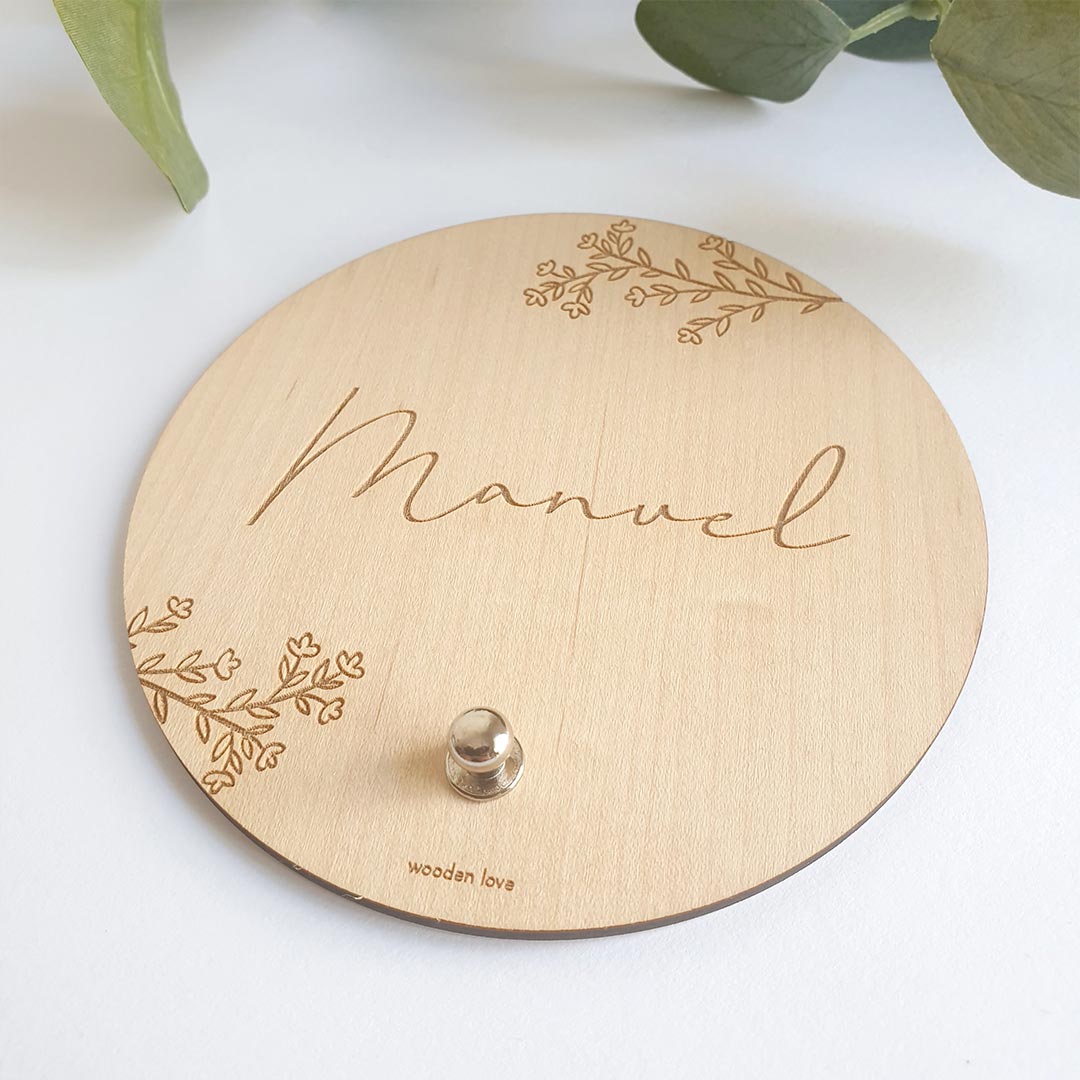 Placa de madera personalizada con nombre grabado y colgador metálico color a elegir.