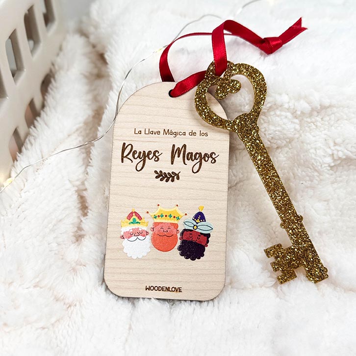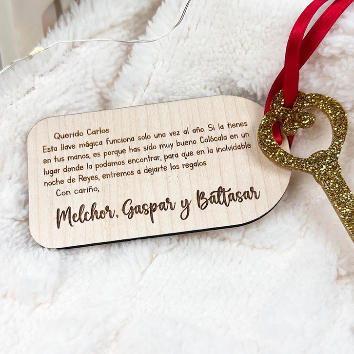 Llave mágica con mensaje personalizado de sus Majestades los Reyes Magos. Sorprende a los más pequeños con ella y explícales que deben de colocarla en un lugar visible, para que Los Reyes Magos puedan entrar en casa a dejar los regalos que esperan con tanta ilusión.