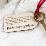 Plaquita de madera grabada con los nombres que nos indiques, llave mágica en el acabado de metacrilato que más te guste y cinta de satén.