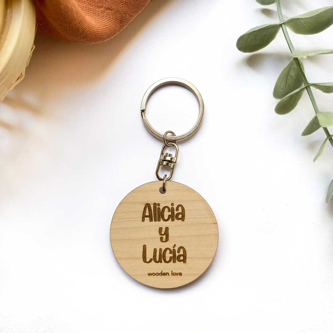 Fabricado en madera con acabado natural de alta calidad de 5 cm de diámetro, metacrilato de diferentes colores y llavero metálico.